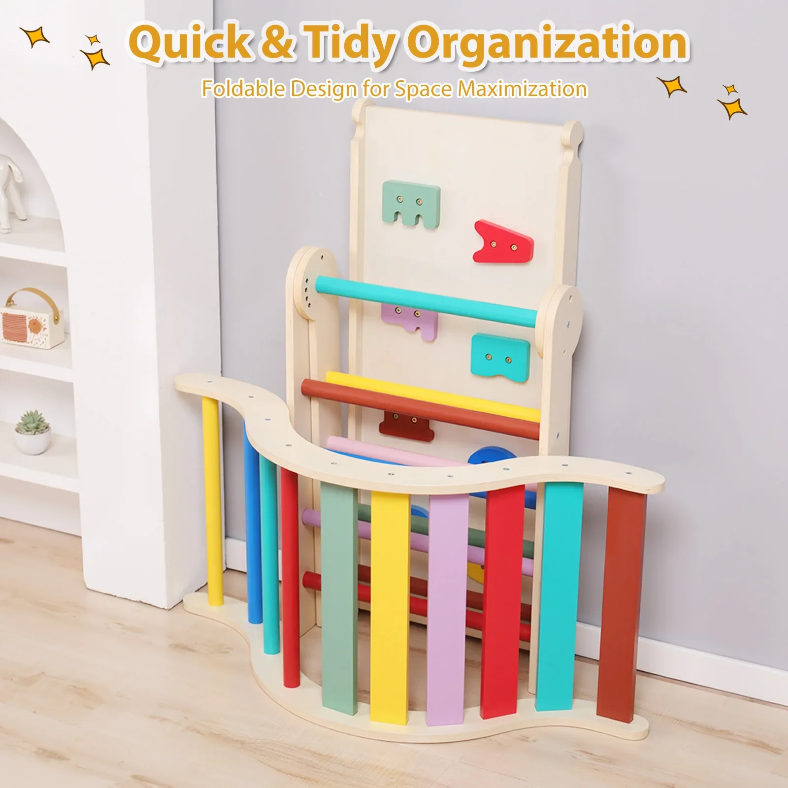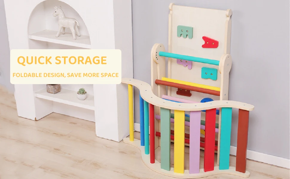 With four adjustable angle settings, practitioners can vary the level of challenge as children develop strength and coordination. The frame also folds flat for convenient storage, making it practical for shared or flexible learning spaces.
